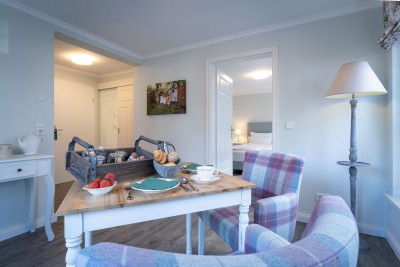 Woran liegt es, dass wir uns in der Suite Gentle Bliss so wohl fühlen? An den Vorhängen mit ihren wundervollen Hortensien und Rosen, die wirklich zu duften scheinen? An der großzügigen Terrasse, auf der wir uns herrlich ausstrecken und relaxen können? Oder doch an der Sonne, die uns hier über den ganzen Tag durch die vielen Fenster begleitet? Wichtig ist doch eigentlich nur, dass es uns gut geht. Welch ein Glück!